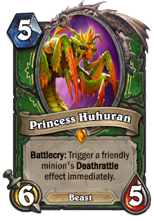 Princess Huhuran (tradução: Princesa Huhuran) é a lendária de Caçador e seu efeito é: Grito de Guerra: Ative o Último Suspiro de um lacaio aliado imediatamente.