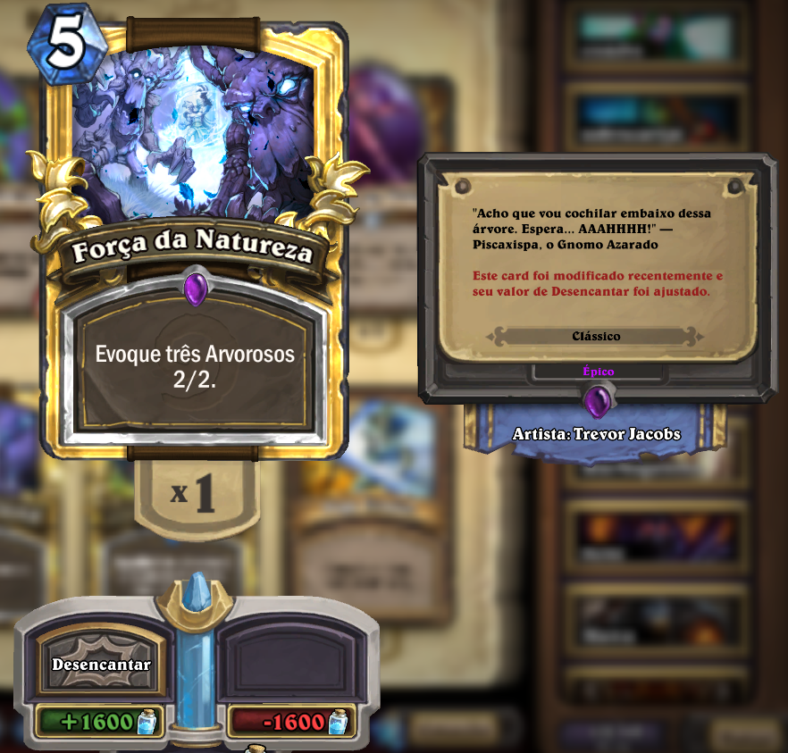 Olá galera, já está valendo a lista de nerfs da Blizzard! Com a atualização que foi baixada, aparece mensagem na tela, como mostram as figuras abaixo e as cartas já podem ser desencantadas pelo valor de custo (como mostra a primeira imagem da postagem). Para quem ainda não viu quais são as cartas nerfadas, é só conferir nas imagens abaixo!