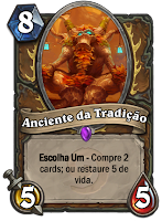 Eles se pronunciaram sobre essa carta e falaram que não acham uma boa nerfá-la. Eu discordo um pouquinho só. Se eu fosse a Blizzard, eu iria querer que as pessoas comprassem mais cartas de outros sets e essa carta é forte o suficiente para roubar a posição de qualquer drop 6, 7 e 8 que ela trouxer para o jogo, sem que ela quebre muito. Por exemplo, por algum tempo, o [Anciente da Guerra] e o [Ragnaros] ocupavam orgulhosamente o slot na curva 7 e 8, até aparecerem [Dr. Cabum] pra chutar o Rag e depois o [Imperador Thaurissan] pra chutar o [Anciente da Guerra]. Ambas as cartas são muito mais fortes que as outras duas, mas não foram o suficiente para tirar o [Anciente da Tradição]. Imagina só o que que teria que aparecer para tirar UM deles, imagina se aparece algo que tira OS DOIS!