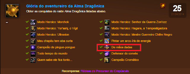 A conquista “De mãos dadas” consiste em ligar os dois últimos condutores cristalinos com o raio passando entre todos os jogadores do grupo, na fase de raios. A chefe onde ganhamos esta conquista é a Haggara, na raide Alma Dragônica. Para isso você precisa matar o lacaio elemental da fase de raios, após isso, a pessoa/grupo que o matou será “eletrizada”, e com essa eletricidade vai ligar todos condutores da sala. Dizem que é solável com hunter e um pet.